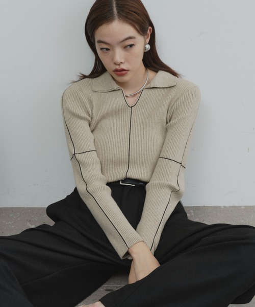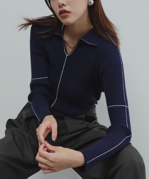 襟付きラインリブニットプルオーバー
